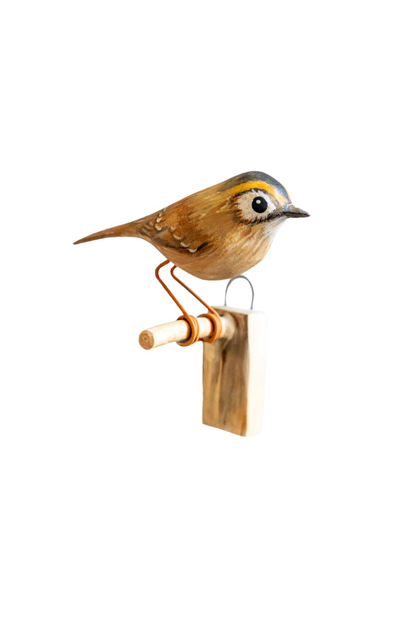 Je nejen naším, ale dokonce evropským nejmenším ptákem. Dorůstá jen 9 cm a váží 6g. Je to ptáček velice čiperný, neustále neposedně popolétává a poskakuje po větvích. Zpívá tak vysokým hláskem, že některé tóny lidé ani nemusí slyšet. Sameček má nepřehlédnutelnou oranžovožlutou ozdobu hlavičky, kterou při zpěvu pyšně čepýří. Zdržuje se v jehličnatých lesích a nejraději má ty smrkové. V jejich větvích i hnízdí. Ptáček je vytvořen v životní velikosti.