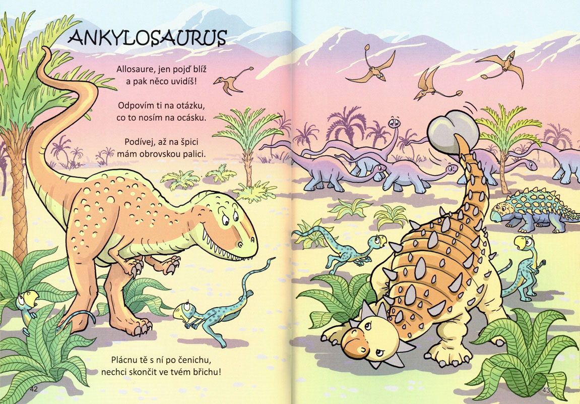 Každý z dinosaurů, který prošel konkurzem do mé knížky, žil odlišným způsobem. Dohromady pak složí pestrou mozaiku pravěkého světa, který hýřil rozmanitostí. Tu ukazují i podrobné celostránkové ilustrace, do kterých jsou básničky zasazeny.