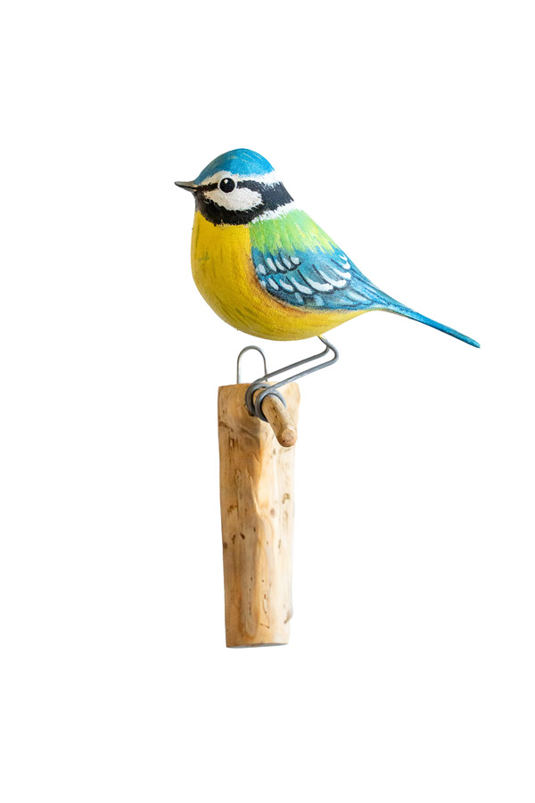 Každý z Vás ji určitě zná. Díky krásnému žlutomodrému zbarvení totiž není k přehlédnutí a navíc se ráda zdržuje poblíž lidských sídel. V zimě s oblibou navštěvuje připravená krmítka a na jaře nepohrdne připravenou ptačí budkou k hnízdění. Pokud jí do krmítka připravíte lojovou kouli, můžete uvidět i její charakteristické chování – zavěšení s hlavou dolů, které v přírodě s oblibou používá při ozobávání tenoučkých větviček stromů. Ptáček je vytvořen v životní velikosti.